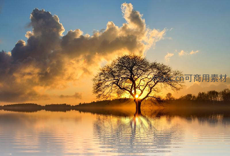晨曦初露,一棵孤树伫立湖中,阳光穿透云层洒下金辉,水面如镜倒映天光树影,营造出超凡脱俗的静谧美景。