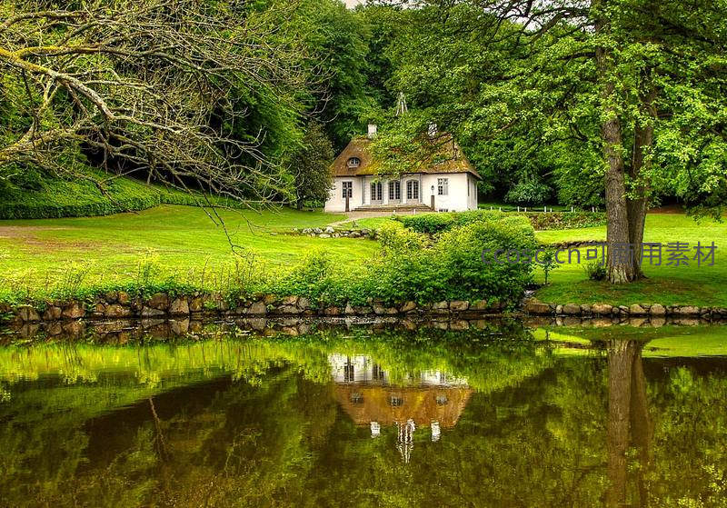 一座白色小屋隐匿于葱郁绿野之中,前方池塘如镜,完美倒映屋宇与树木,仿佛置身童话世界,散发宁静祥和的田园气息。