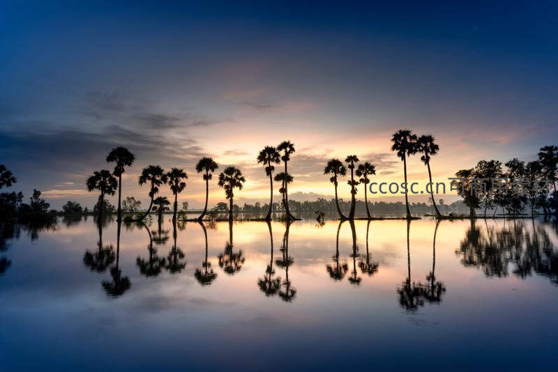 夕阳西下,湖面如镜,棕榈树剪影与彩霞交相辉映,倒影清晰,营造出宁静祥和的热带黄昏美景。