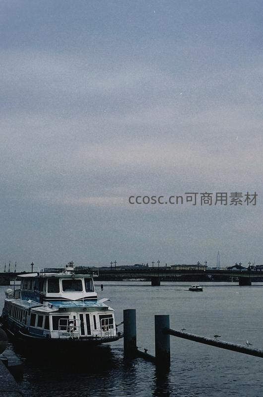 一艘白色渡轮静静停靠在河岸码头,背景是横跨水面的长桥,天空阴云密布,整体色调沉静,充满都市水岸的宁静氛围。
