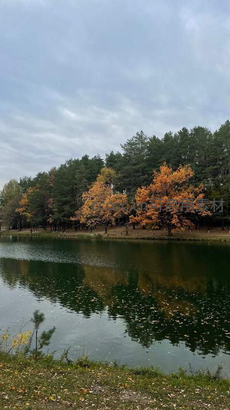 平静的湖面如镜,清晰倒映着岸边色彩斑斓的秋树,金黄与墨绿交织,微风轻拂,落叶飘零,营造出诗意而宁静的秋日画卷。