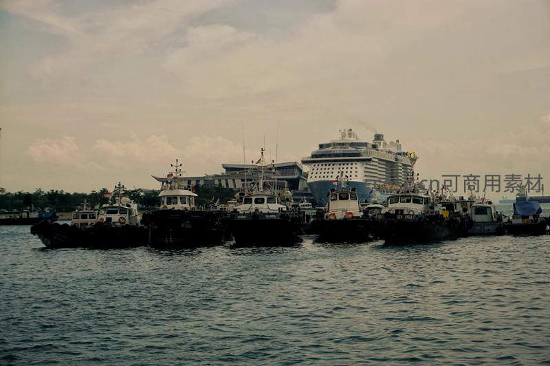数艘小型拖船整齐排列在港口,正协助一艘巨大的现代化邮轮停靠或离港,展现了现代港口繁忙的作业场景和强大的运输能力。