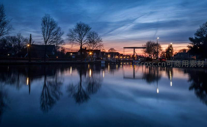 宁静的水乡小镇在黄昏时分,房屋与街灯的暖光倒映在平静水面,形成对称美景,远处天际线染上橙红霞光。