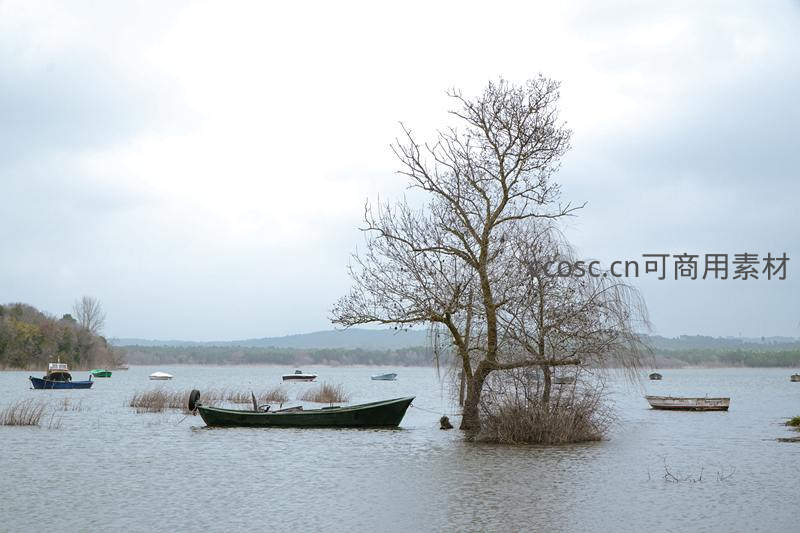 灰蒙天空下,几艘小船静静漂浮于湖面,一棵无叶枯树伫立水中,枝干苍劲,营造出一种寂寥、沉静又略带忧郁的自然意境。