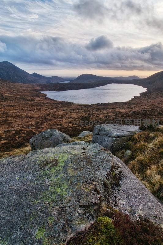 荒原巨石俯瞰静湖,远山云影共黄昏