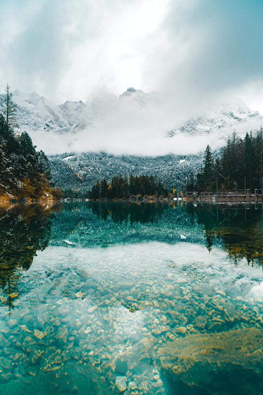 雪峰云雾锁幽湖,澄澈水底见石纹