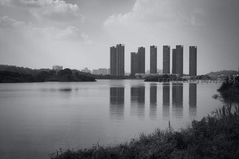 以黑白滤镜呈现的城市湖景,几栋高耸的现代化建筑倒映在平静的水面上,形成完美的镜像。前景的植被与天空的云朵,共同构筑了沉静而富有张力的画面。