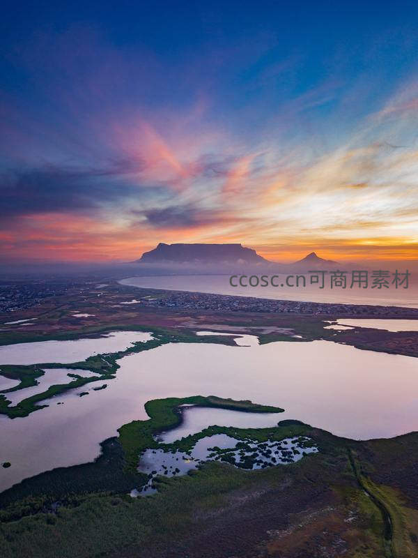 从高空俯瞰,桌山在绚烂的日出云霞中巍然屹立。下方是蜿蜒的湿地水道和广袤的海岸平原,光影交织,展现出大自然无与伦比的宏伟与宁静。