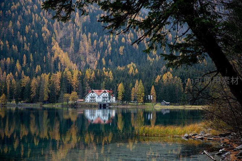 一座白色小屋静立湖畔,四周环绕着色彩斑斓的秋日森林,其倒影在平静水面清晰可见,宛如童话场景。