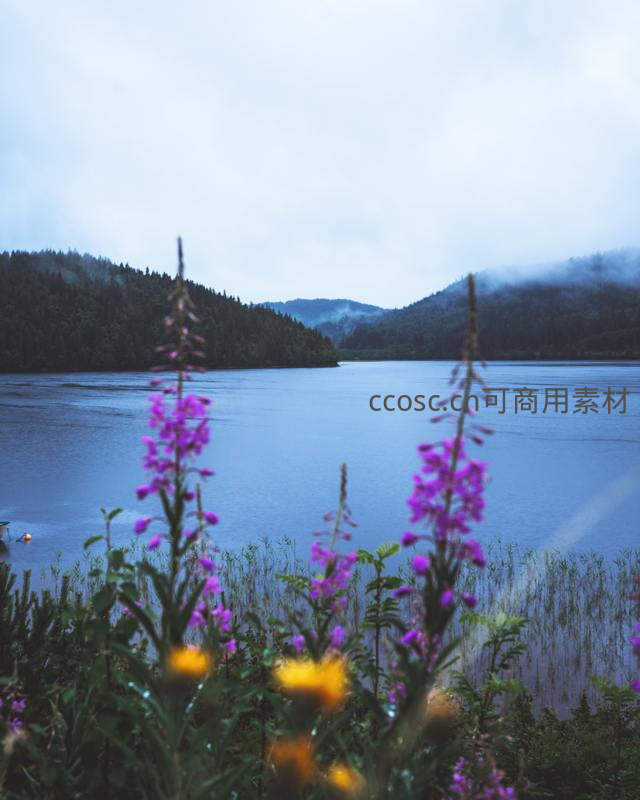 湖畔紫花迎风摇曳,远山雾霭如梦似幻