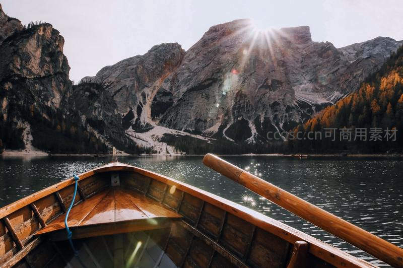 从木舟视角望向高耸岩壁,阳光穿透云层洒在湖面,波光粼粼,秋日林木染上金黄,尽显壮丽山水间的探险氛围。