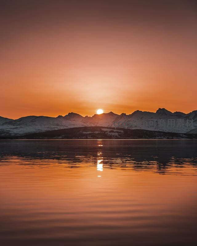 一轮落日将天空染成温暖的橙红色,光芒洒在远处的雪山上,其倒影在波光粼粼的湖面上轻轻摇曳,营造出如梦似幻的黄昏景象。