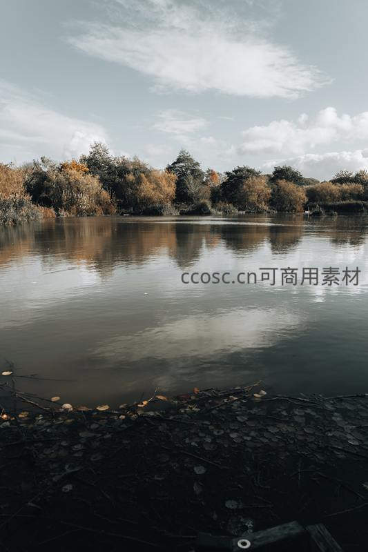 平静的湖面如镜,清晰倒映着岸边色彩斑斓的秋日树林和飘动的云朵。前景散落枯叶与枝条,营造出深秋特有的静谧与萧瑟氛围。