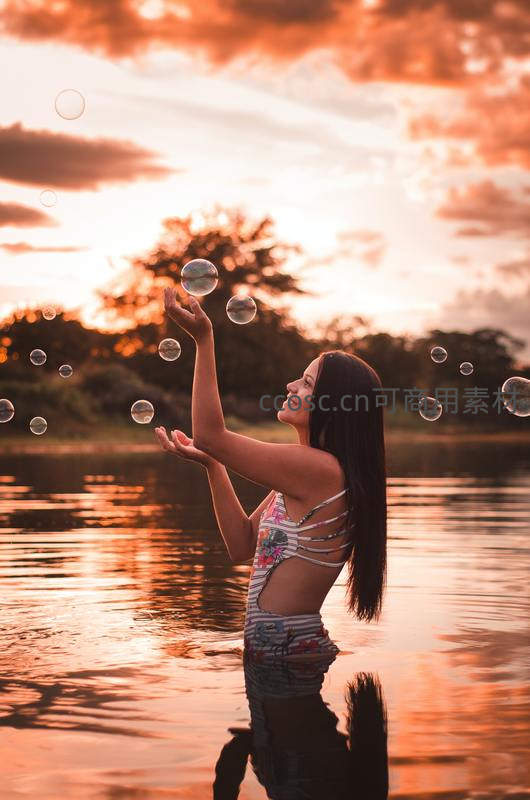 夕阳湖边少女戏泡,光影梦幻浪漫
