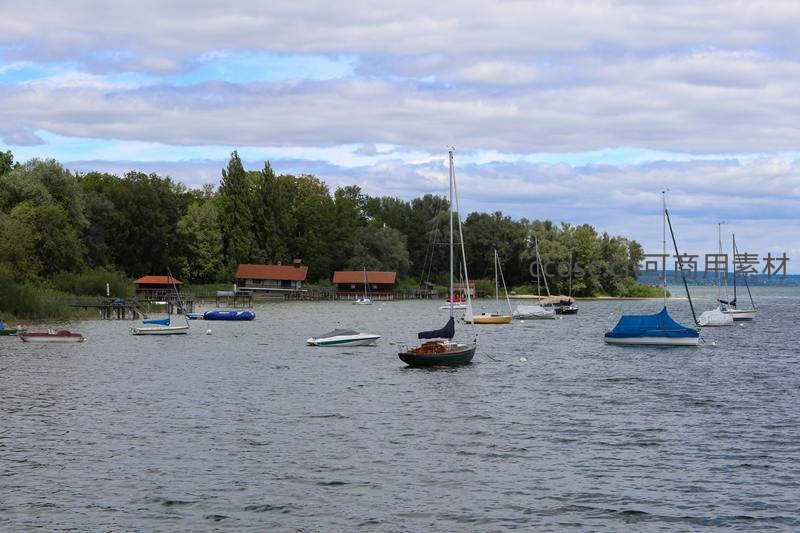湖面停泊着多艘帆船,岸边绿树掩映木屋与码头,微风轻拂水面,营造出悠闲惬意的度假氛围。