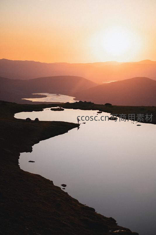 黄昏时分,金色阳光洒满山谷,平静湖面倒映着远山轮廓,一人伫立水边,享受天地间无垠的静谧与壮美。
