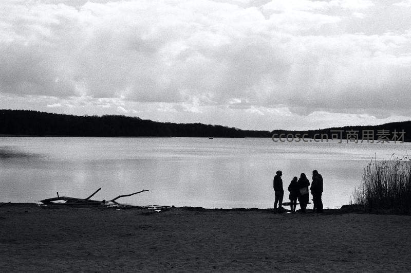 黑白影像中,四人静立湖岸,背对镜头凝望水面,天空云层厚重,画面充满诗意与沉思,传递出孤独与陪伴的复杂情感。