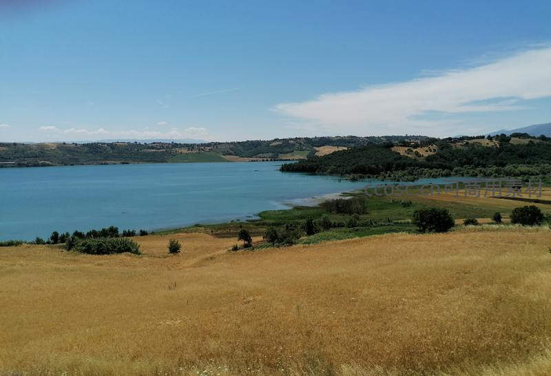 广阔的金色麦田延伸至湖畔,湛蓝湖水与远处青山相接,天空澄澈,构成一幅宁静祥和的田园画卷,令人心旷神怡。