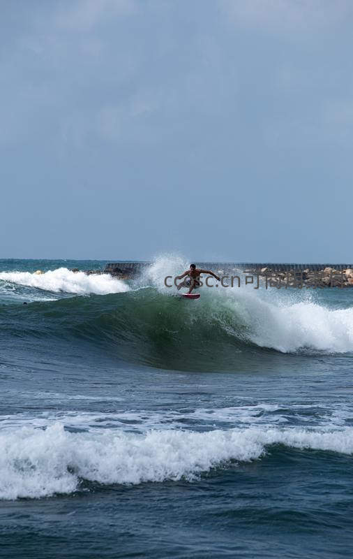 冲浪者在碧波巨浪中保持平衡,身体舒展,激起层层水花,展现人与自然搏击的勇气与技巧,充满动感与活力。