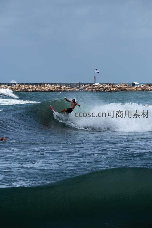 冲浪者在卷起的浪壁上划出优美弧线,背景是远处防波堤与飘扬旗帜,动静结合,定格了挑战极限的精彩一刻。