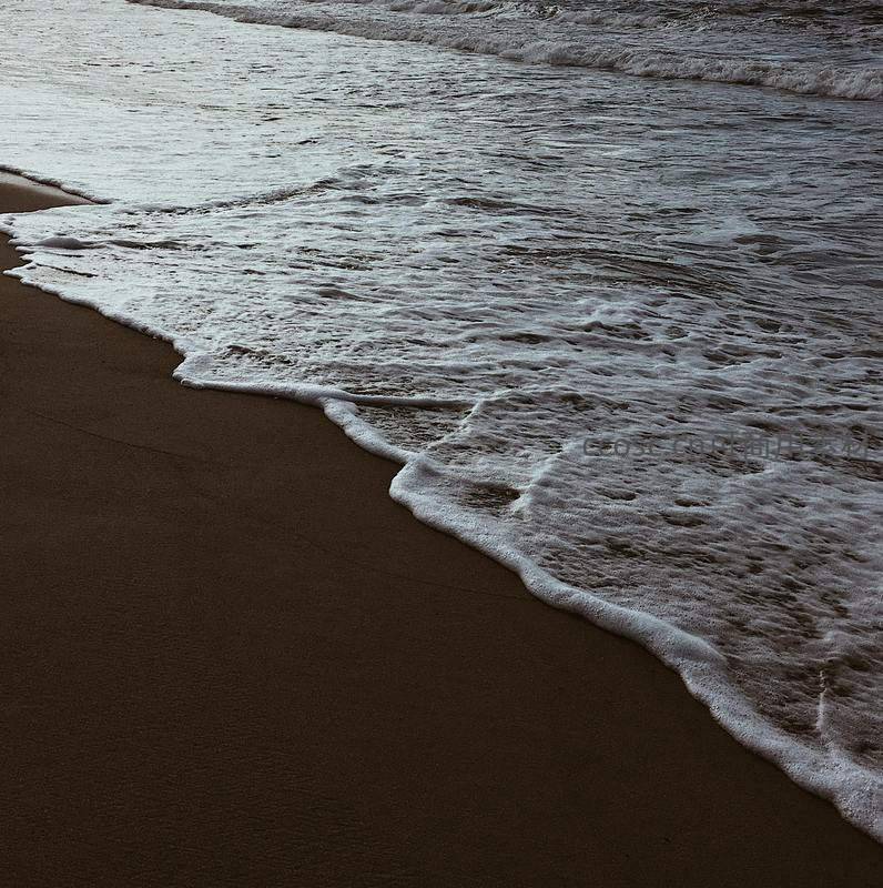 天色渐暗,海浪带着白色泡沫缓缓退去,在湿润的沙滩上留下痕迹,画面充满沉静与诗意的黄昏气息。