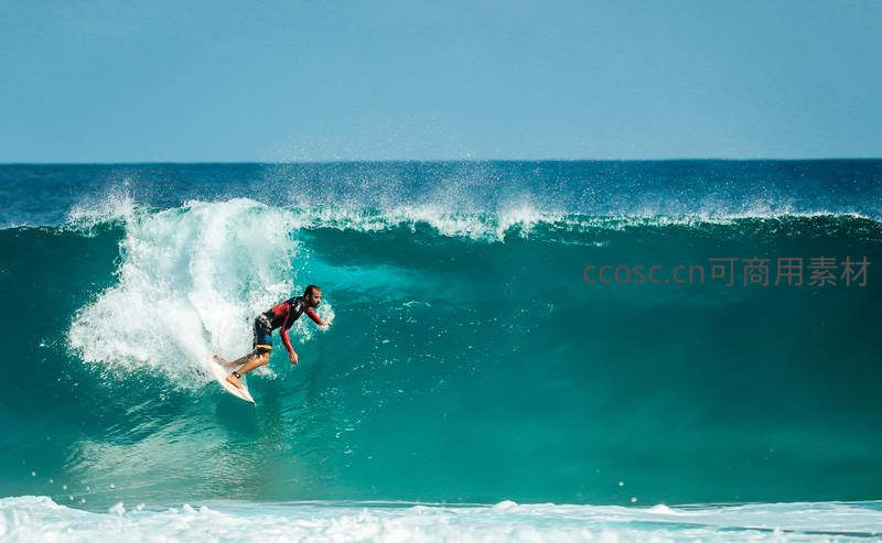 蓝海巨浪翻卷,冲浪者穿梭浪壁间