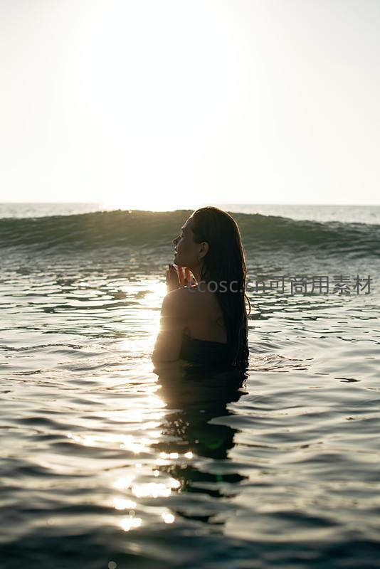 一位女子在金色夕阳下的海水中静立,阳光洒在水面上波光粼粼,营造出宁静而唯美的氛围。