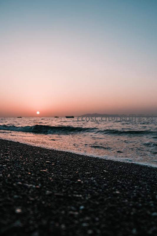 黄昏海滩远景,落日余晖温柔