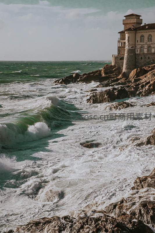 汹涌的海浪猛烈拍打着嶙峋的黑色礁石,一座古老的欧式城堡矗立在悬崖之上,与壮阔的海洋形成强烈对比,展现出自然与人文的和谐共生。