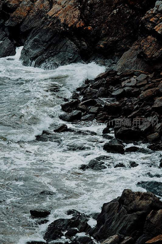 深色的嶙峋礁石被汹涌的白色浪花猛烈冲击,水花四溅,展现出大海原始而狂野的力量感,画面充满动感与视觉张力。