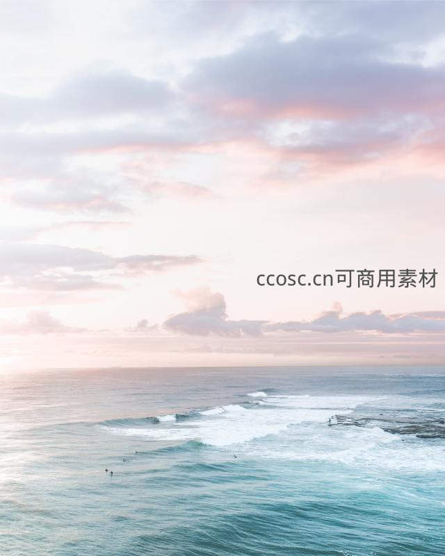 黄昏时分,天空被染成柔和的粉紫色,云层如薄纱般铺展。海面上波浪翻涌,几位冲浪者点缀其间,享受着大自然赋予的宁静与动感时刻。
