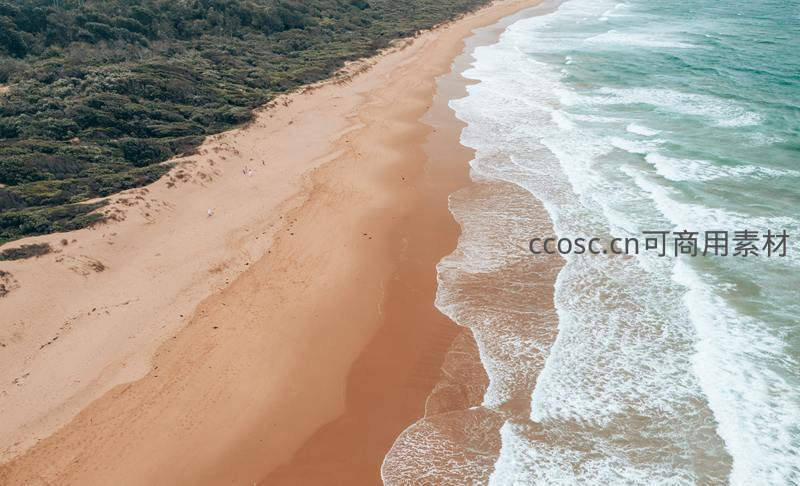 航拍视角下,金黄色的沙滩蜿蜒伸展,一侧是郁郁葱葱的绿色植被覆盖的沙丘,另一侧是碧绿的海水不断拍打岸边,构成一幅和谐壮丽的自然生态图景。