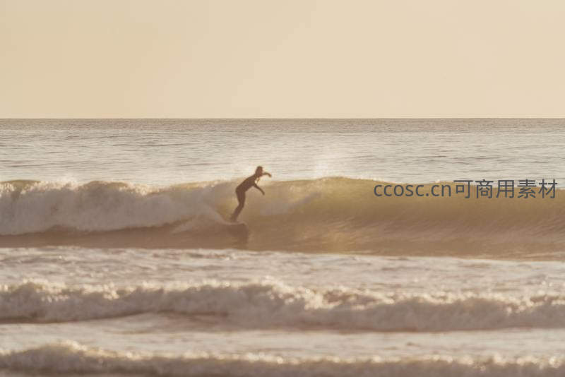 在温暖的夕阳光线下,一名冲浪者的剪影优雅地滑行于金色波浪之上,展现人与自然共舞的力量与美感。
