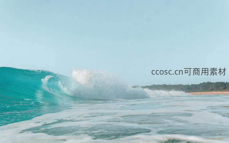 清澈碧蓝的海浪在晴空下翻滚,洁白的浪花四溅,远处是郁郁葱葱的树林与沙滩,构成一幅纯净而充满生机的海滨画卷。