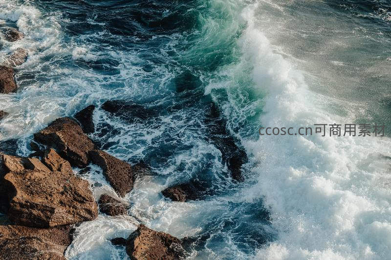 汹涌的深蓝色海浪以雷霆万钧之势撞击着棕褐色的坚硬礁石,瞬间爆裂成漫天飞舞的白色泡沫,如同雪花般四散,彰显大海无与伦比的原始力量。