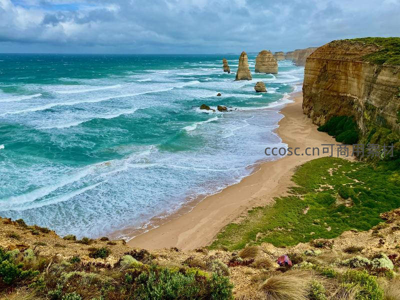 壮丽的十二门徒岩群从碧绿的海水中拔地而起,与金色沙滩和陡峭悬崖构成绝美画卷。海浪层层叠叠拍打着岸边,云层低垂,景色恢弘而宁静。