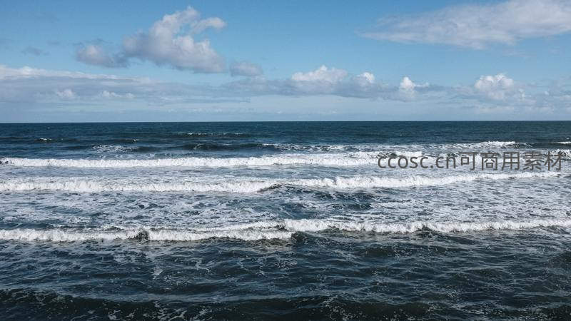 晴朗天空下,海浪一层层涌向岸边,洁白的泡沫与深蓝海水形成鲜明对比,带来宁静而开阔的视觉享受。