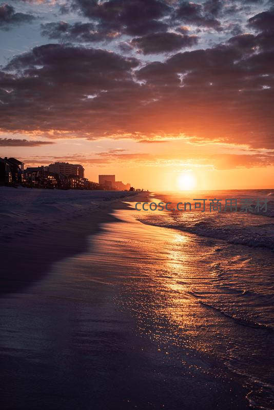 壮丽的夕阳将天空染成金红色,海浪轻抚沙滩,远处的城市建筑群在霞光中形成剪影,构成一幅宁静而宏大的海滨黄昏画卷。
