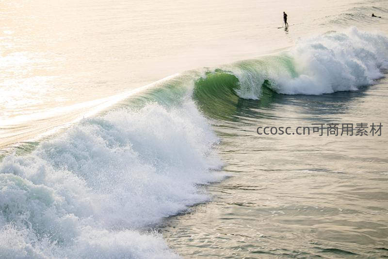 在金色夕阳的映照下,一名冲浪者稳立于碧绿色的巨浪之巅,享受着速度与激情,展现人与自然和谐共舞的瞬间。
