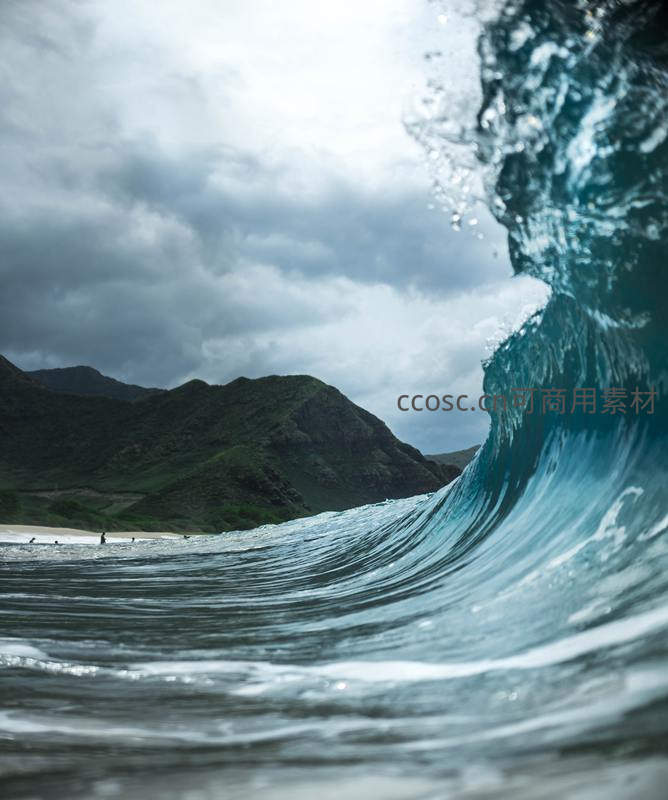 从浪花内部视角拍摄,巨大的海浪即将拍岸,背景是连绵的青山和厚重的乌云,展现了海洋的磅礴力量与自然的壮丽景色。