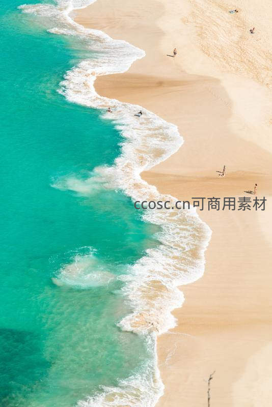 高空俯瞰清澈的碧绿色海水与金黄色沙滩交汇,白色浪花如丝带般蜿蜒,几人悠闲漫步,构成一幅宁静而完美的热带海滨画卷。