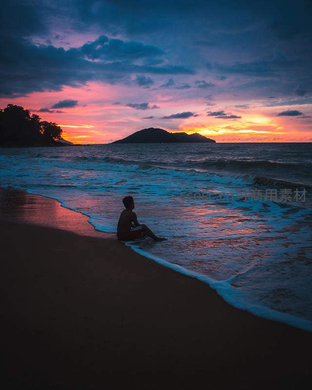一人独坐沙滩边缘,凝望远方岛屿与燃烧般的晚霞,海浪温柔拍打脚边,营造出诗意的沉思氛围。
