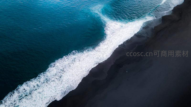 深邃的黑色火山沙与湛蓝海水形成强烈视觉冲击,洁白浪花如丝带般勾勒边界,呈现地球独特地貌的壮美与神秘。