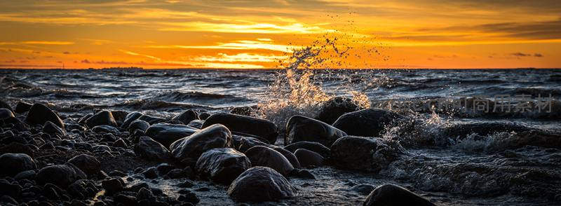 金红色的夕阳将天空染成暖色调,海浪猛烈拍打岸边的礁石,激起晶莹水花,在静谧中迸发出令人心潮澎湃的力量。