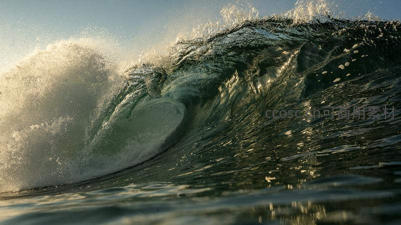 汹涌的巨浪在阳光照射下泛着晶莹绿光,浪尖崩裂瞬间激起飞沫四溅,水珠在光线下如钻石般闪耀,呈现海洋原始力量的视觉盛宴。
