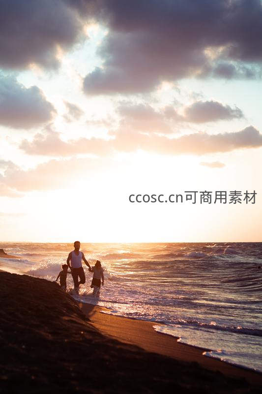 金色夕阳洒满海面,一家三口手牵手漫步沙滩,剪影勾勒出幸福轮廓,海风轻拂,定格温暖瞬间。