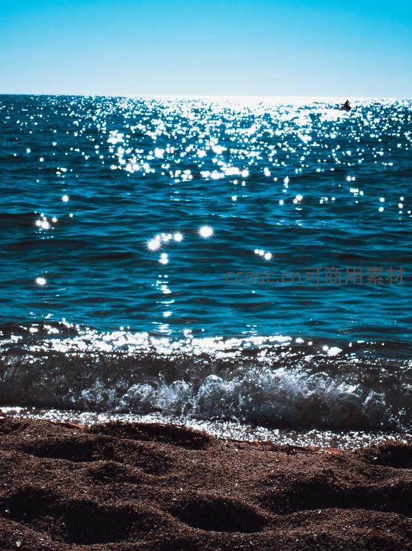 晴朗天空下,湛蓝海水被阳光点亮,闪烁如繁星。温柔浪花轻抚深色沙滩,远处隐约人影点缀,营造出静谧而壮丽的海滨画卷。