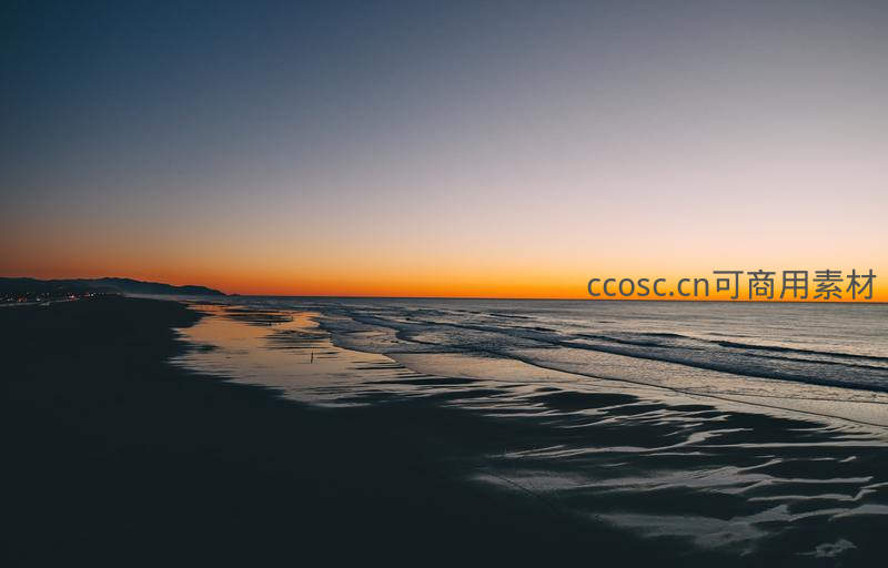 夕阳西下,天边燃起一片绚烂的橙红,温柔的海浪轻抚着湿润的沙滩,远处山峦与城市灯火在暮色中若隐若现,营造出极致的宁静与诗意。