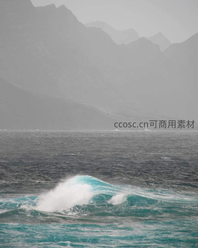 汹涌的碧蓝海浪在前景翻滚,激起白色浪花,背景是笼罩在薄雾中的连绵灰黑色山脉,构成一幅壮阔而宁静的自然画卷。