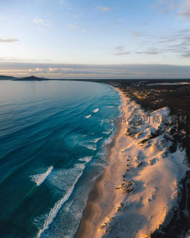 夕阳的余晖将海岸线染成金色,波光粼粼的蓝色大海温柔地拍打着沙滩,远处的沙丘和陆地沐浴在温暖的光线中,营造出宁静祥和的黄昏景象。